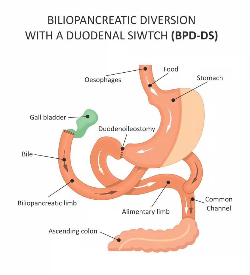 It is a highly effective, weight-loss surgery typically recommended for individuals with severe obesity (BMI > 50). Here a smaller stomach pouch is created, the small intestine is then reconfigured. The food from the small stomach pouch travels directly into the lower part of the small intestine (ileum), bypassing most of the duodenum and jejunum. This significantly reduces the absorption of nutrients and calories.